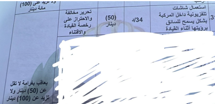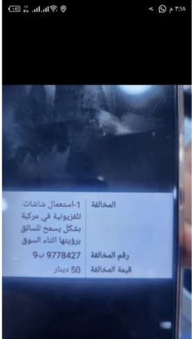 تناقل ناشطون على مواقع التواصل الاجتماعي صورة تُظهر مخالفة مرورية بقيمة 50 ديناراً تحت بند "استعمال السائق لشاشة تلفزيونية في المركبة بطريقة تمكنه من رؤيتها أثناء القيادة".