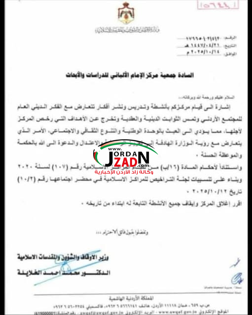 وأوضح القرار أنه استند إلى المادة (16/ب) من نظام المراكز الإسلامية رقم (107) لسنة 2020، وبناءً على توصيات لجنة الترخيص للمراكز الإسلامية في محضر اجتماعها رقم (10/2) بتاريخ 12/10/2025.