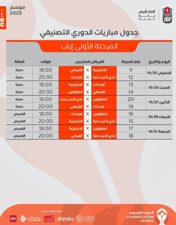 وكان من المقرر أن تُقام مباراة الوحدات والفيصلي في نهاية الدوري التصنيفي، إلا أنه تم نقلها إلى منتصف الجدول، لتُقام عند الساعة الثامنة مساءً من يوم الاثنين الموافق 27/10/2025.