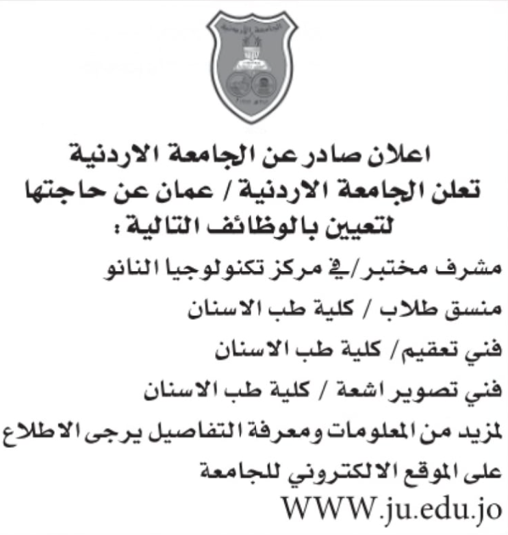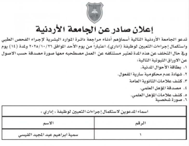 أعلنت الجامعة الأردنية عن دعوة لوظائف شاغرة، ودعت مَن وَرَدَت أسماؤهم لإجراء الفحص الطبي واستكمال إجراءات التعيين.
