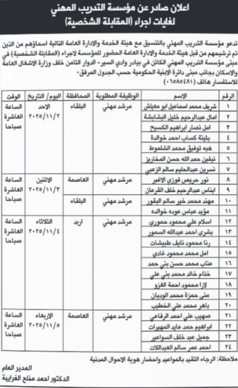 هذا، وأعلنت مؤسسة التدريب المهني عن دعوة 24 شخصًا للمقابلات الشخصية.