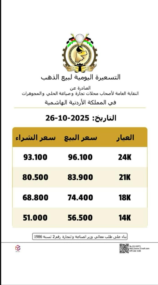 أعلنت النقابة العامة لأصحاب محلات صياغة وتجارة الحلي والمجوهرات استقرار أسعار الذهب في الأردن، اليوم الأحد.