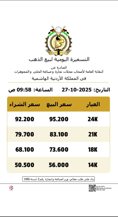 سجلت أسعار الذهب في الأردن اليوم الاثنين انخفاضًا بمقدار 80 قرشًا للغرام، وفق النشرة الصادرة عن النقابة العامة لأصحاب محلات الصياغة وتجارة الحلي والمجوهرات.