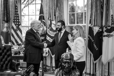 نشر الرئيس الأمريكي دونالد ترمب على حسابه في منصة "تروث سوسيال" صورا من اجتماعه مع الرئيس السوري أحمد الشرع في مكتبه في البيت الأبيض الاثنين.