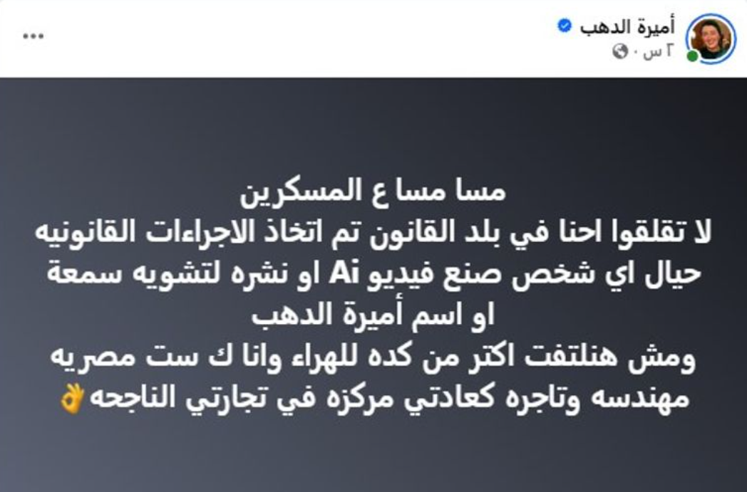 وفي أول تعليق رسمي لها، أكدت "أميرة الذهب" أنها تتعرض لحملة ممنهجة نتيجة نجاحها في مجال تجارة الذهب، مشيرة في منشور عبر حساباتها إلى أنها اتخذت إجراءات قانونية ضد كل من شارك في صناعة أو نشر هذه المواد المفبركة، قائلة: "إحنا في بلد القانون… تم اتخاذ الإجراءات القانونية ضد أي شخص عمل فيديو AI أو نشره لتشويه اسمي، ومش هنلتفت للهراء".
