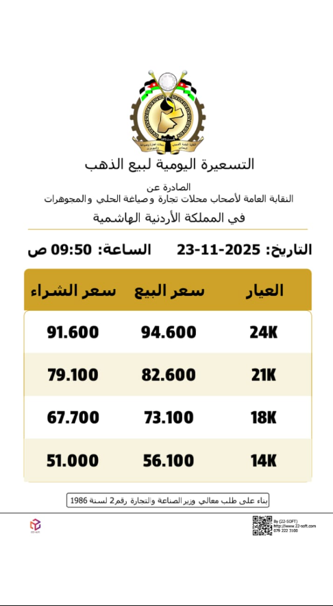 وبحسب النشرة الصباحية الصادرة عن النقابة العامة لأصحاب محلات تجارة وصياغة الحلي والمجوهرات، بلغ سعر الغرام الواحد من الذهب عيارات 24 و18 و14 عند 94.6 و73.1 و56.1 دينارًا على التوالي لغايات البيع من محلات الصاغة.