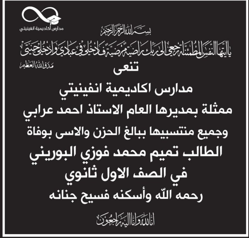 ببالغ الحزن والأسى، نعت الأسرة التعليمية في العاصمة عمّان الطالب تميم محمد فوزي البوريني، من طلاب الصف الأول الثانوي (مواليد 2009)، إثر حادث مؤسف أودى بحياته، تاركاً خلفه أثراً طيباً في قلوب معلميه وزملائه.