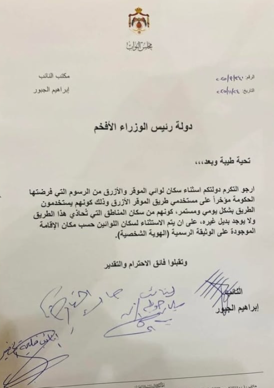 قدم النائب ابراهيم الجبور، اليوم الاثنين، مذكرة نيابية طالب فيها باستثناء أهالي لوائي الموقر والأزرق من دفع الرسوم على طريق الموقر - الازرق المدفوع.