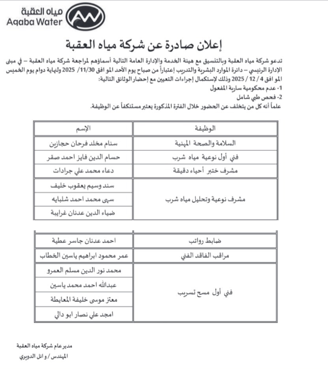 دعت شركة مياه العقبة، اليوم الأحد التالية أسماؤهم لاستكمال إجراءات التعيين.