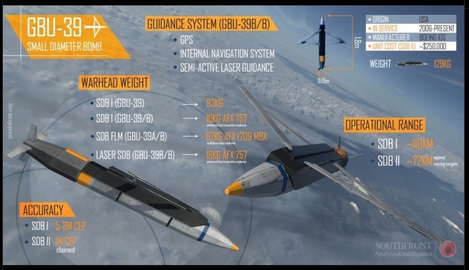 وتعد GBU‑39 واحدة من القنابل الانزلاقية الأكثر تطورًا في ترسانة الجيوش الغربية، تزن نحو 110 كيلوجرامات فقط، لكنها قادرة على اختراق الهياكل الخرسانية والتسبب بأضرار كبيرة مقارنة بحجمها.