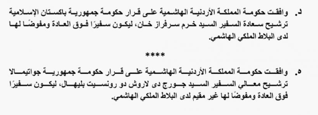 كما صدرت موافقة حكومة المملكة الأردنية الهاشمية على قرار حكومة جمهورية جواتيمالا ترشيح السفير جورج دی لاروش دو رونسيت بليهال، ليكون سفيرا فوق العادة ومفوضًا لها غير مقيم لدى البلاط الملكي الهاشمي.