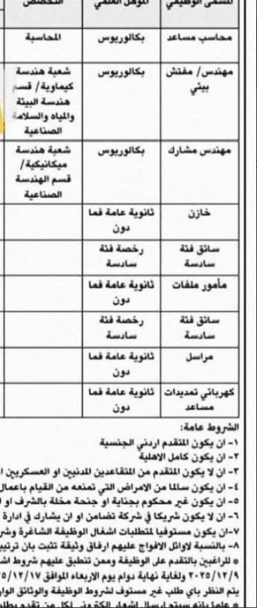 أعلنت وزارة البيئة عن حاجتها لتعيين موظفين من حملة شهادة البكالوريوس، إضافة إلى سائقين من الحاصلين على شهادة الثانوية العامة فما دون.