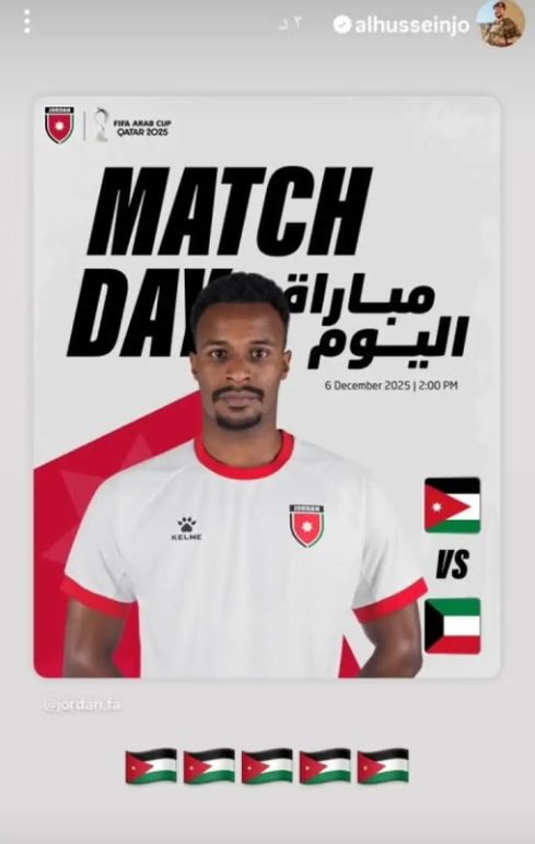 قام سمو الأمير الحسين بن عبدالله الثاني، ولي العهد، بإعادة نشر صورة للاعب المنتخب الوطني عبدالله نصيب، مرفقة بعلمي الأردن والكويت، مع إضافة عدد من الأعلام الأردنية، في تعبير واضح عن الحماس والدعم قبيل المواجهة المرتقبة بين منتخب النشامى ونظيره الكويتي ضمن بطولة كأس العرب 2025.