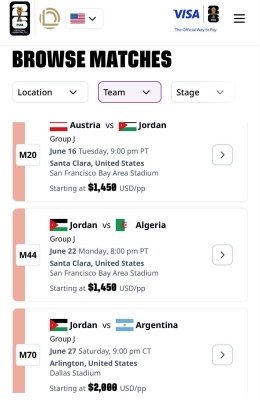 تداول ناشطون عبر مواقع التواصل الاجتماعي صورة تُظهر أن سعر تذكرة مباراة منتخب الأردن ونظيره الأرجنتيني في كأس العالم يصل إلى 2000 دولار أمريكي (أكثر من 1400 دينار)، وأن سعر التذكرة لمواجهتي النمسا والجزائر يبلغ 1450 دولاراً (أكثر من 1025 ديناراً).