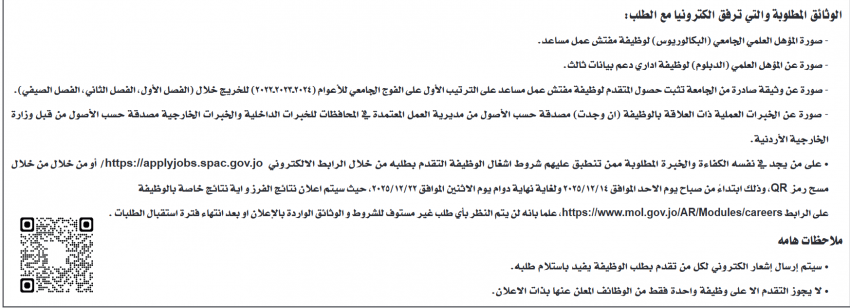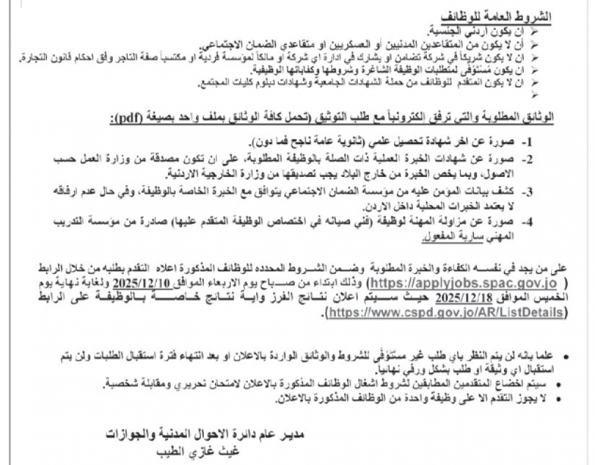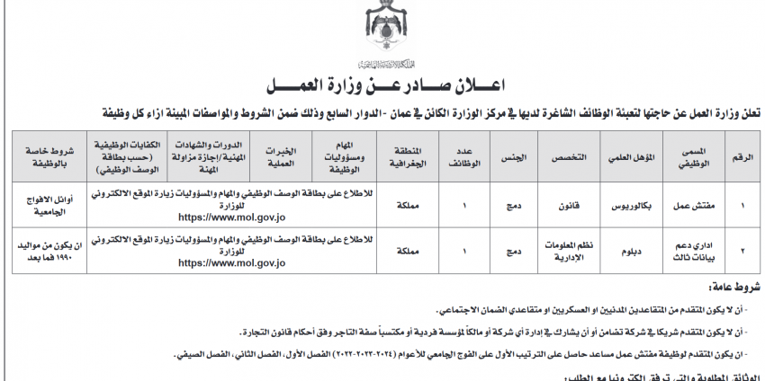 أعلنت دوائر في القطاع الحكومي حاجتها لتعيين أشخاص لملئ شواغر في وزارة العمل ودائرة الأحوال المدنية والجوازات.