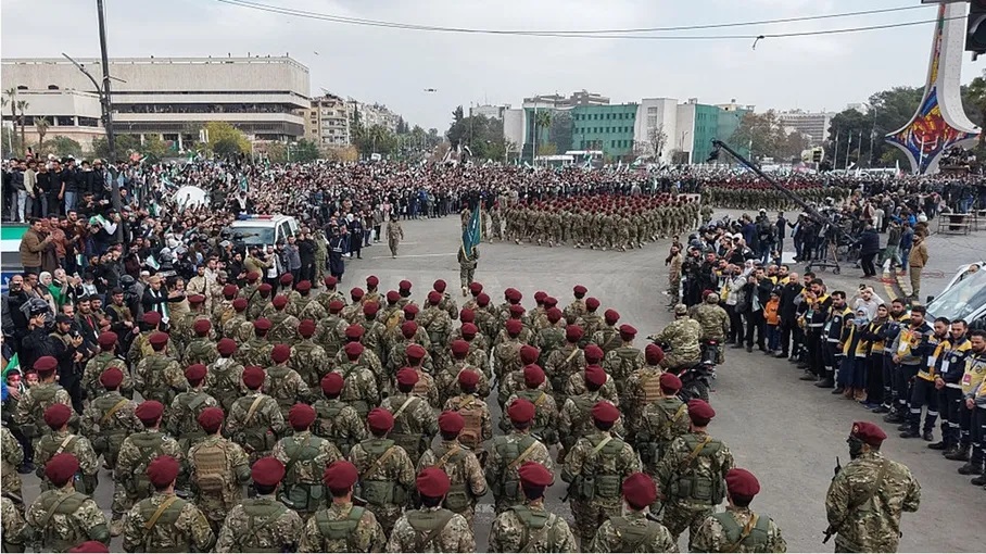 وفي دمشق، شهدت العاصمة الاثنين مسيرة عسكرية ضمن احتفالات "عيد التحرير"، ردد خلالها الجنود هتافات داعمة لغزة، التي شهدت خلال العامين الماضيين إبادة إسرائيلية خلّفت أكثر من 70 ألف شهيد، وأكثر من 171 ألف جريح، غالبيتهم من النساء والأطفال.