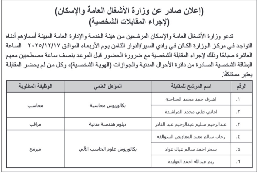 أعلنت وزارة الأشغال العامة والإسكان، اليوم الأربعاء، عن توجيه الدعوة لعدد من المتقدمين للوظائف لديها، والذين وردت أسماؤهم في القائمة المرفقة، للحضور إلى مبنى الوزارة وإجراء المقابلة الشخصية وفق المواعيد المحددة لكل منهم.