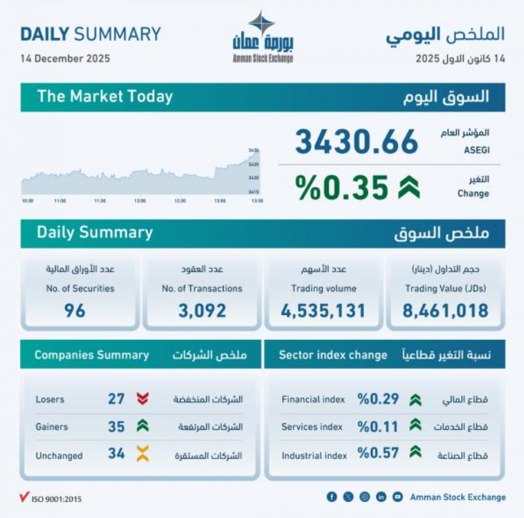 بورصة عمان تغلق تداولاتها على ارتفاع