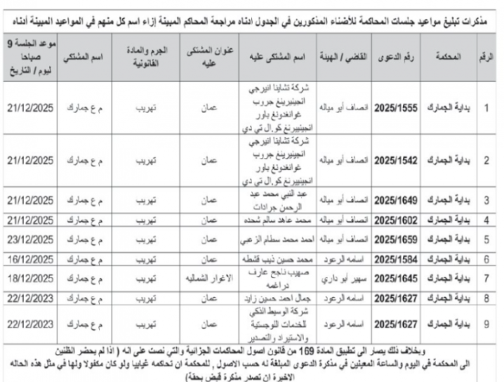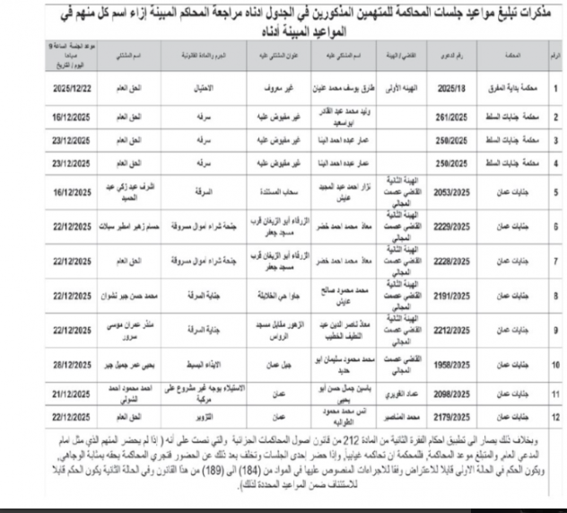 صدرت اليوم الاثنين، مذكرات تبليغ بمواعيد جلسات المحاكمة لمشتكى عليهم في المحاكم النظامية.