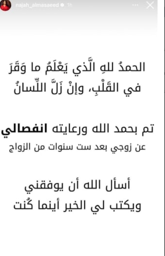 أعلنت الإعلامية والشاعرة الأردنية نجاح المساعيد، اليوم الاثنين، انفصالها عن زوجها.