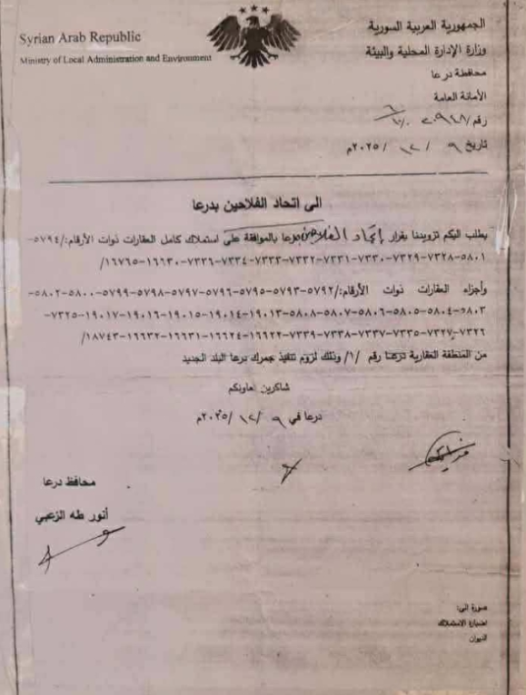 وجّه محافظ درعا، أنور الزعبي، كتاباً رسمياً إلى اتحاد الفلاحين في المحافظة، يطلب فيه الموافقة على استملاك كامل العقارات الواردة أرقامها ضمن المنطقة العقارية (نمر/1)، وذلك بهدف تنفيذ مشروع معبر حدودي جديد مع الأردن.
