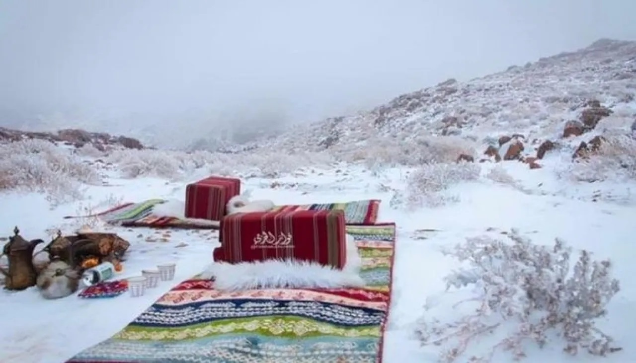 سجّل جبل اللوز في منطقة تبوك في السعودية، اليوم الأربعاء، تساقطًا كثيفًا للثلوج، تزامن مع انتشار واسع للضباب على المرتفعات، في أجواء اتسمت برياح شديدة وانخفاض ملحوظ في درجات الحرارة، حيث بلغت أربع درجات مئوية تحت الصفر.