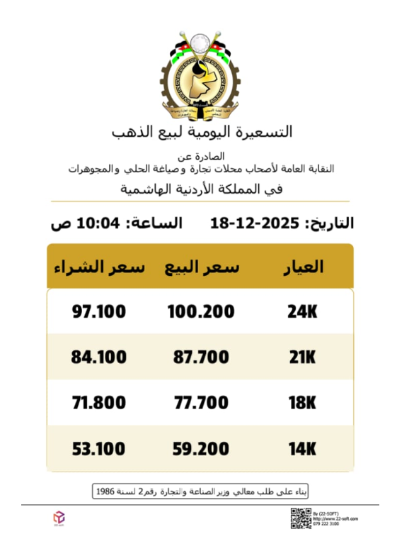 وبحسب النشرة الصباحية الصادرة عن النقابة العامة لأصحاب محلات تجارة وصياغة الحلي والمجوهرات، سجل غرام الذهب عيارات 24 و18 و14 للبيع 100.20 و77.70 و59.20 دينار على التوالي.