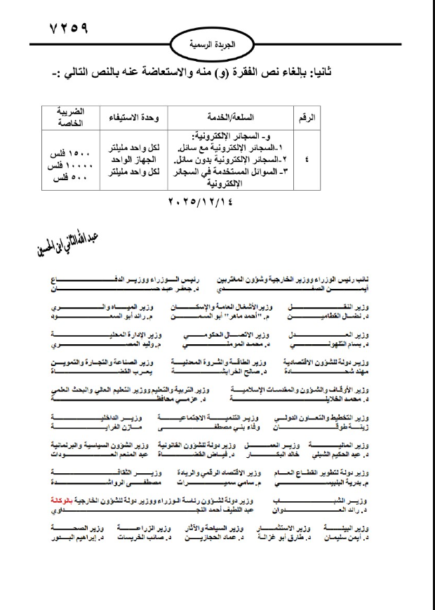 وأصبحت الضريبة الخاصة على السوائل المستخدمة في السجائر الإلكترونية (500 فلس) لكل واحد ملليتر.