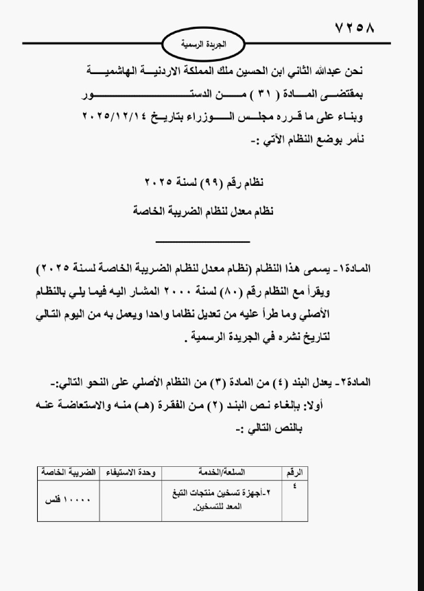صدر في عدد الجريدة الرسمية، الأحد، نظام معدّل نظام الضريبة الخاصة لسنة 2025، لعدة سلع ومنتجات متعلقة بتسخين التبغ والسجائر الإلكترونية.