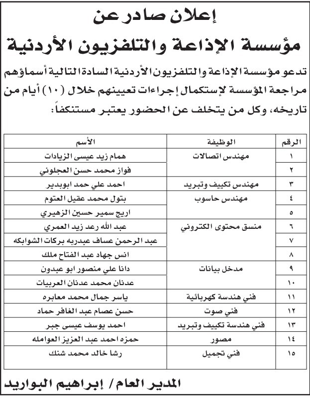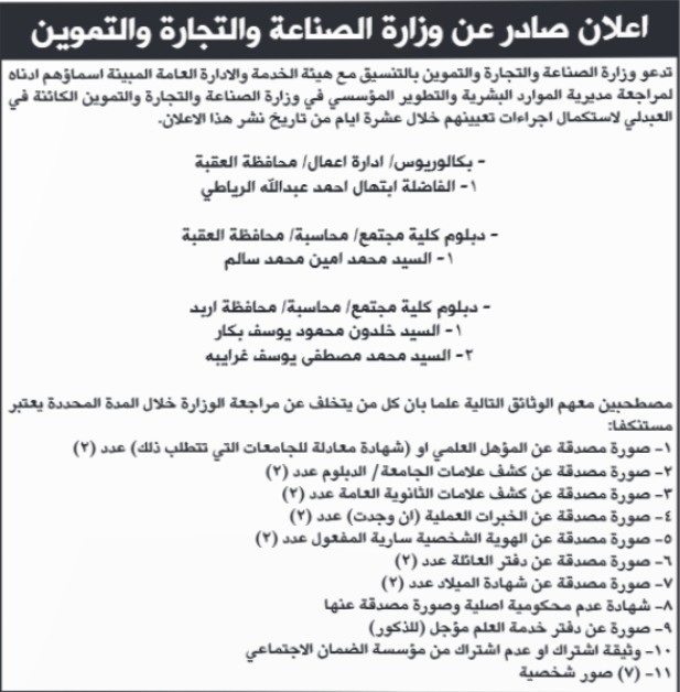 دعت دوائر حكومية، اليوم الثلاثاء، التالية أسماؤهم، لاستكمال اجراءات التعيين.
