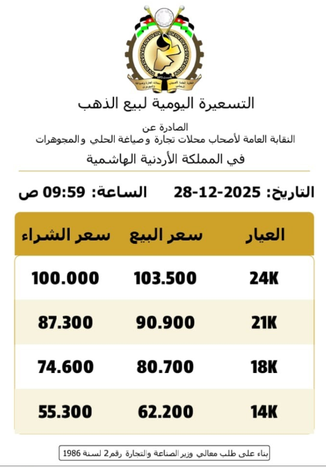 وأوضحت النقابة العامة لأصحاب محلات تجارة وصياغة الحلي والمجوهرات أن أسعار الغرام للعيارات الأخرى كانت: 24 عند 103.50 دينار، و18 عند 80.70 دينار، و14 عند 62.20 دينار للبيع من محلات الصاغة.