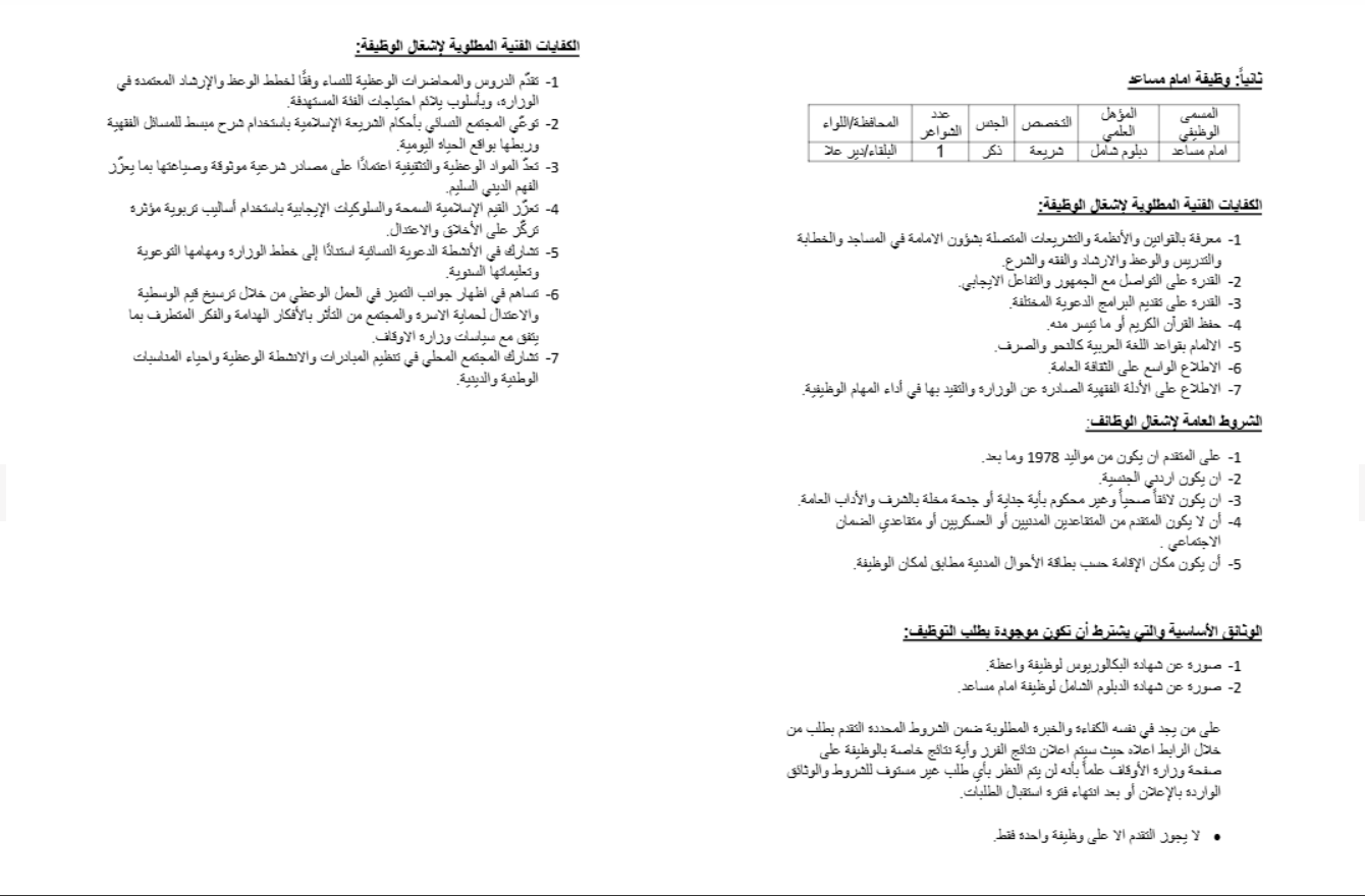 اعلنت وزارة الأوقاف والشؤون والمقدسات الاسلامية عن حاجتها لتعبئة الوظائف الشاغرة وفقاً لاحتياجات الوزارة على مكان الاقامة المبينة في الاعلان المرفق أدناه .