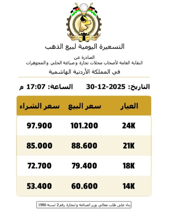 شهدت أسعار الذهب المحلية في الأردن اليوم الثلاثاء ارتفاعًا بمقدار 40 قرشًا للغرام في التسعيرة الثانية الصادرة عن نقابة الحلي والمجوهرات.