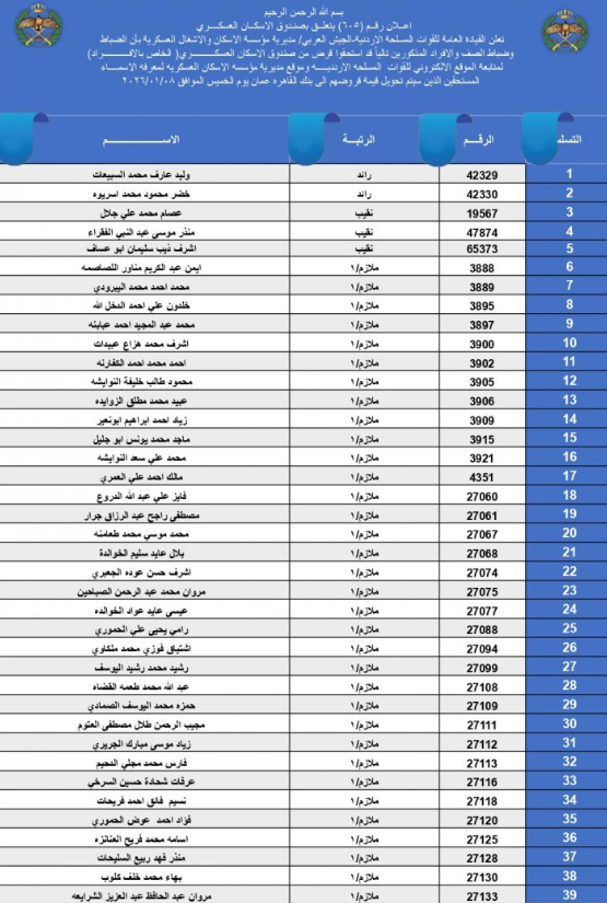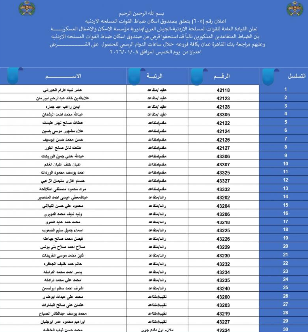 أعلنت القيادة العامة للقوات المسلحة الأردنية – الجيش العربي/ مديرية مؤسسة الإسكان والأشغال العسكرية عن أسماء الضباط وضباط الصف المستحقين قرض الإسكان العسكري(الخاص بالافراد).