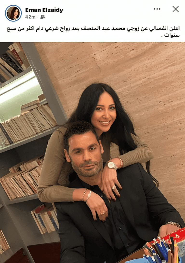 ونشرت إيمان الزيدي صورة تجمعها بمحمد عبدالمنصف عبر حسابها في فيسبوك، وأرفقتها بتعليق قالت فيه: "بعد زواج شرعي دام 7 سنوات، أعلن انفصالي عن زوجي"، وهو ما لفت أنظار المتابعين وتداولوه على نطاق واسع.