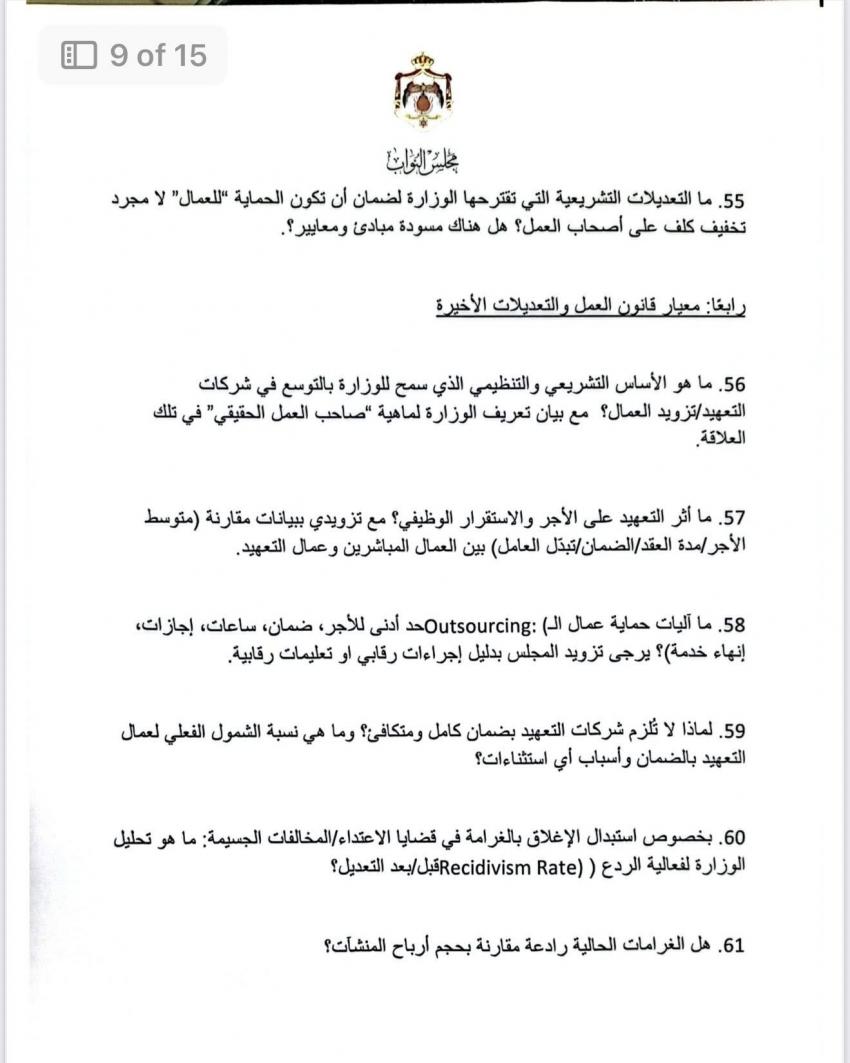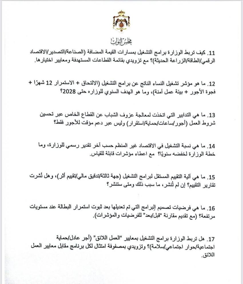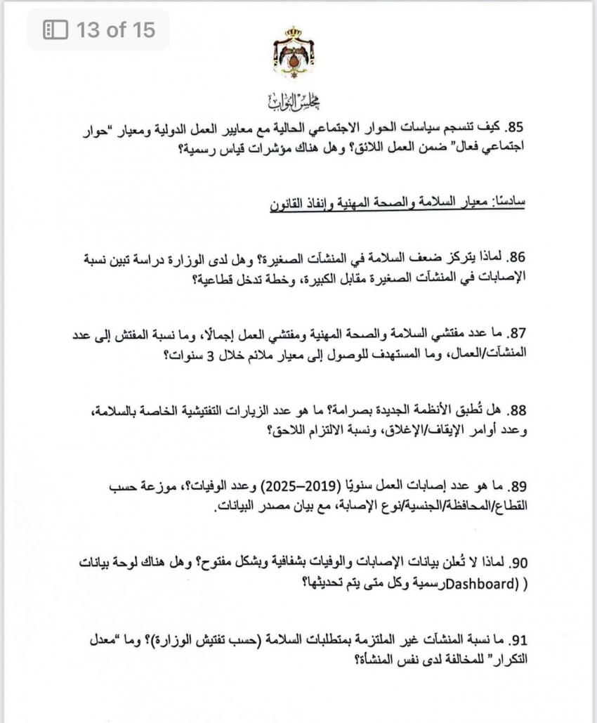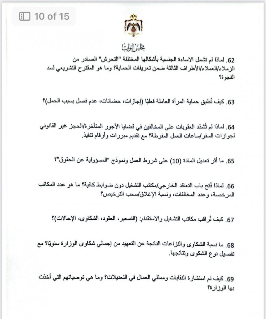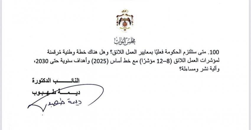 في أطول استجواب بتاريخ مجلس النواب الأردني، وجهت النائب ديمة طهبوب 100 سؤال استجوابي إلى وزير العمل حول تطبيق معايير العمل اللائق.