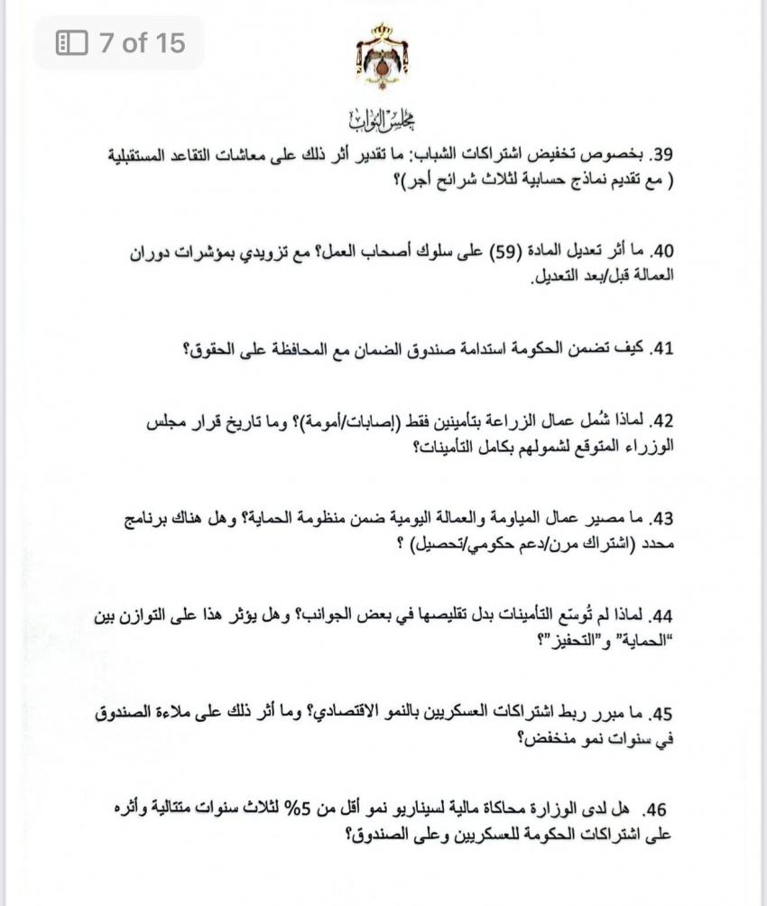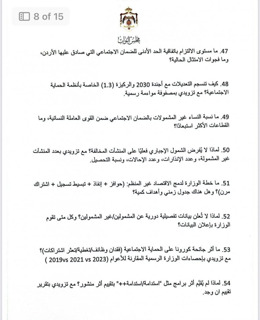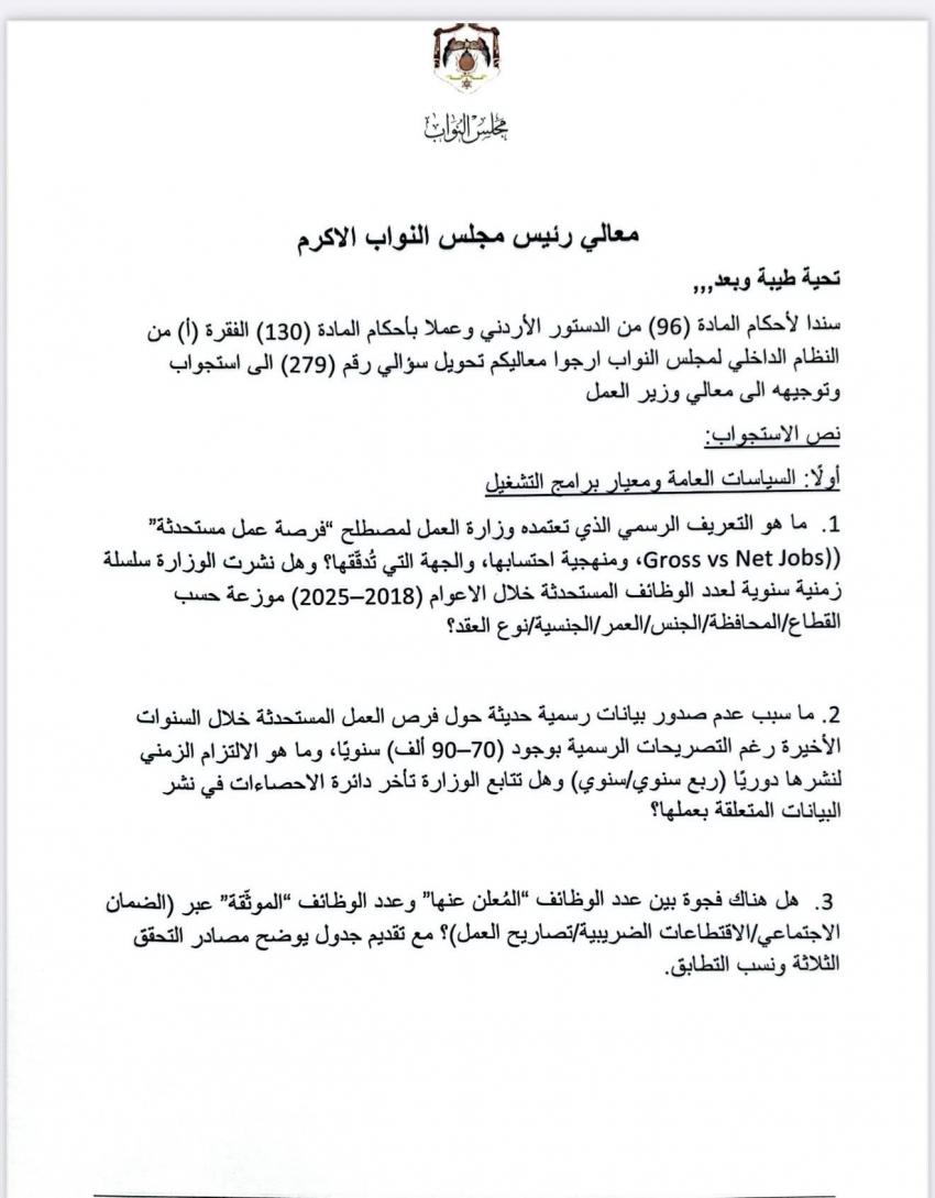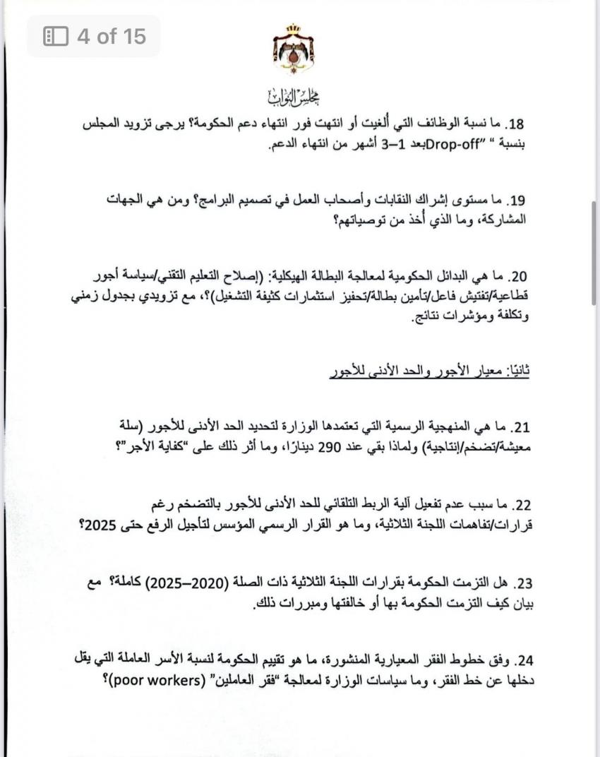في أطول استجواب بتاريخ مجلس النواب الأردني، وجهت النائب ديمة طهبوب 100 سؤال استجوابي إلى وزير العمل حول تطبيق معايير العمل اللائق.