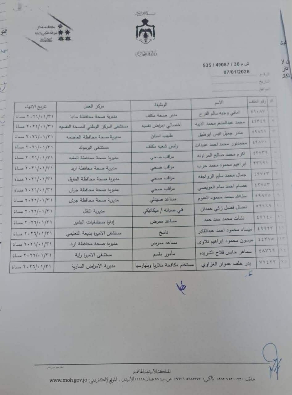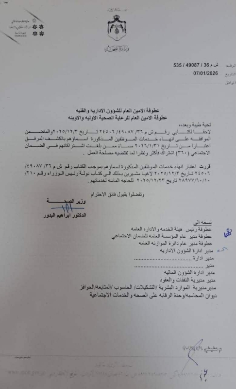 ألغى وزير الصحة الدكتور ابراهيم البدور ، اليوم الاربعاء، قرارا اداريا في الوزارة يتعلق بايقاف 15 موظفا عن العمل