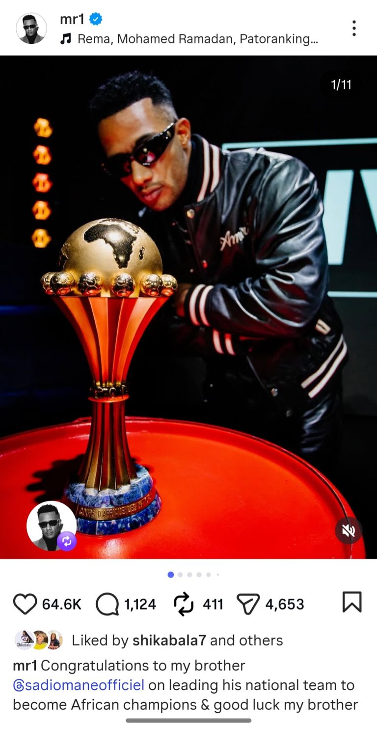 جّه الفنان محمد رمضان تهنئة خاصة للنجم السنغالي ساديو ماني عقب فوزه بجائزة أفضل لاعب في كأس أمم أفريقيا 2025.