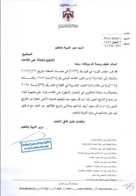 قرر مجلس الوزراء الموافقة على إحالة الموظفين المذكورين تالياً بعد ترفيعهم للدرجة الأعلى إلى التقاعد بناء على طلبهم.