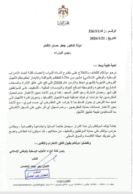 وجّه رئيس كتلة اتحاد الأحزاب الوسطية والوطني الإسلامي النيابية النائب الكابتن زهير الخشمان كتابًا رسميًا إلى دولة رئيس الوزراء الدكتور جعفر حسان، طالب فيه بتأجيل الأقساط الشهرية المترتبة على المواطنين خلال شهري شباط وآذار من عام 2026.