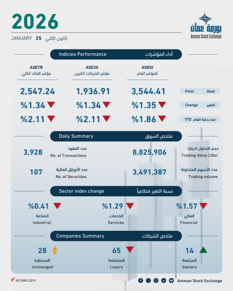 سجلت بورصة عمان اليوم الأحد، حجم تداول إجمالي بلغ 8.8 مليون دينار وعدد أسهم متداولة قدره 3.5 مليون سهم تم تنفيذها من خلال 3928 عقدًا.