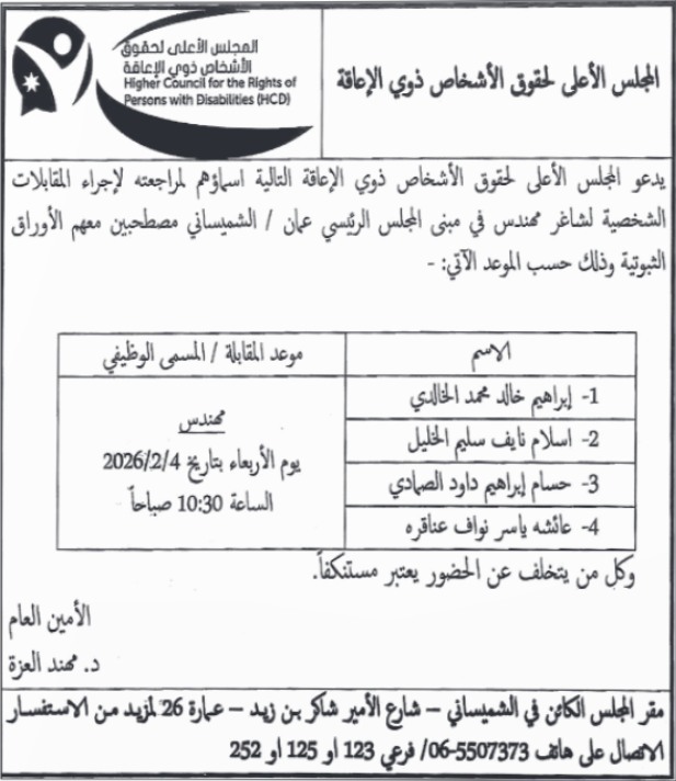دعا المجلس الأعلى لحقوق الأشخاص ذوي الإعاقة الأسماء الواردة إلى التقدم لإجراء المقابلات الشخصية، وذلك وفق المواعيد المحددة.