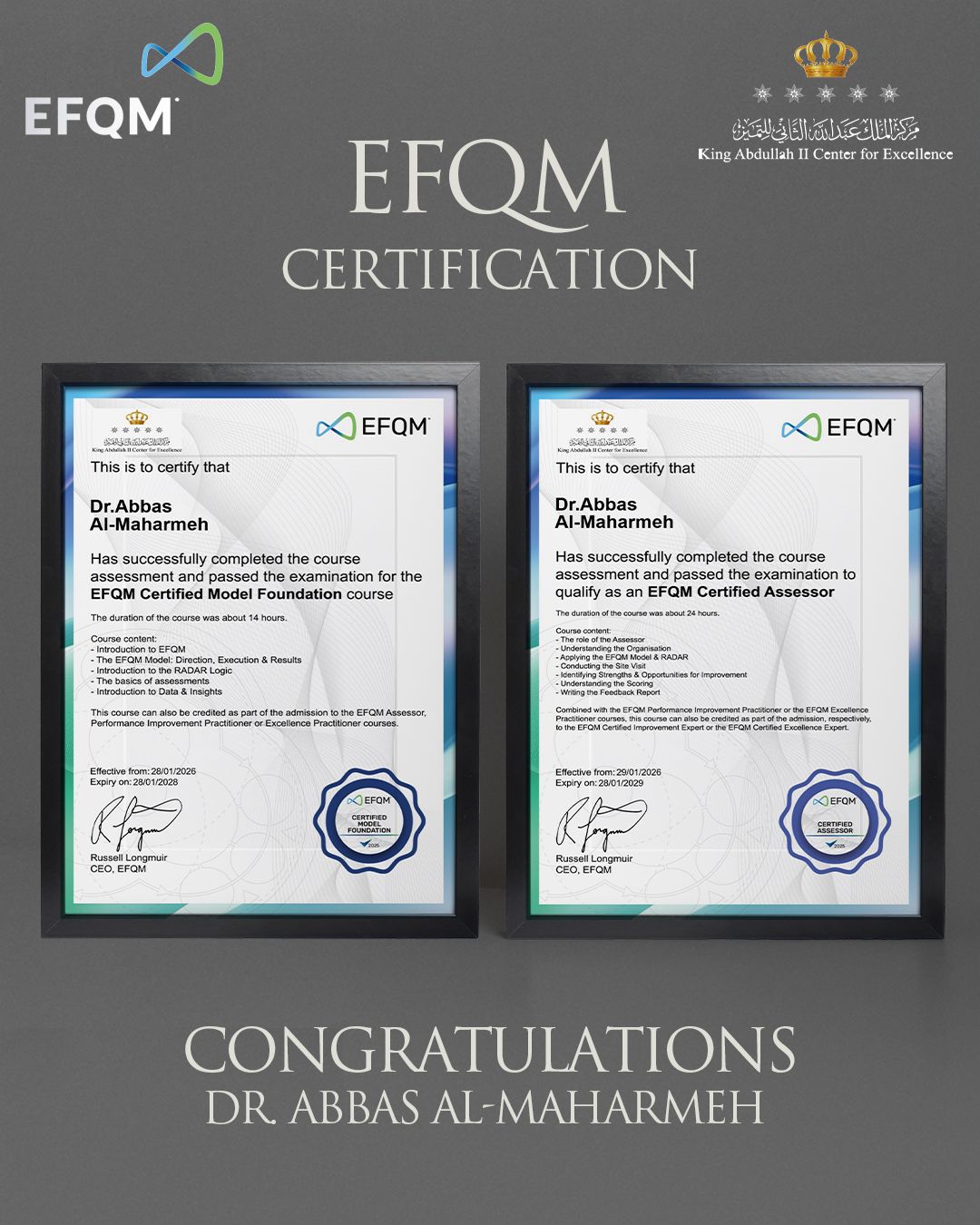 وجاء حصول الدكتور المحارمة على هذين الاعتمادين بعد اجتيازه متطلبات البرامج التدريبية والامتحانات بنجاح، والتي أقيمت في مركز الملك عبدالله الثاني للتميز، أحد أبرز المراكز الوطنية المعنية بنشر ثقافة الجودة والتميّز المؤسسي في الأردن.
