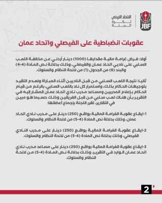 قررت لجنة الانضباط والسلوك في الاتحاد الأردني لكرة السلة، اليوم الأربعاء، فرض عقوبات تأديبية على فريقي الفيصلي واتحاد عمّان نتيجة ممارسة اللعب السلبي خلال المباريات الأخيرة.