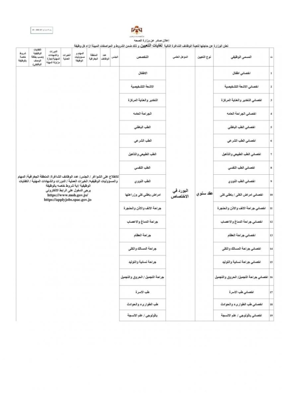 أعلنت وزارة الصحة عن حاجتها لتعيين اطباء اخصائيين من كافة التخصصات العامة والفرعية.