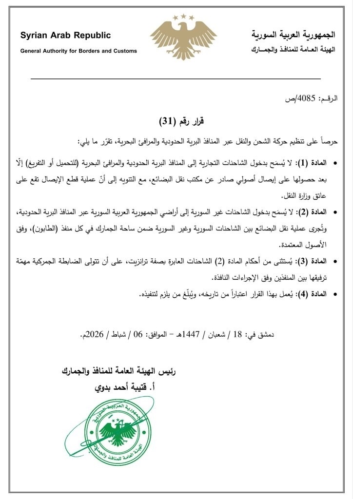 وأصدرت الهيئة العامة للمنافذ والجمارك السورية، الجمعة، قراراً يقضي بعدم السماح بدخول الشاحنات التجارية إلى المنافذ البرية الحدودية والمرافئ البحرية للتحميل أو التفريغ، إلا بعد حصولها على إيصال أصولي صادر عن مكتب نقل البضائع، بحيث تقع عملية قطع الإيصال على عاتق وزارة النقل، وذلك في إطار تنظيم حركة الشحن والنقل عبر المنافذ.