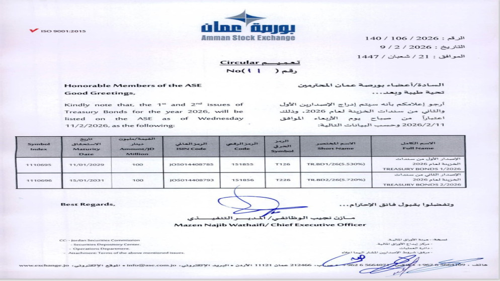 قالت بورصة عمان، في تعميم صادر عنها إنه سيتم الأربعاء إدراج الإصدارين الأول والثاني من سندات الحزينة لعام 2026.