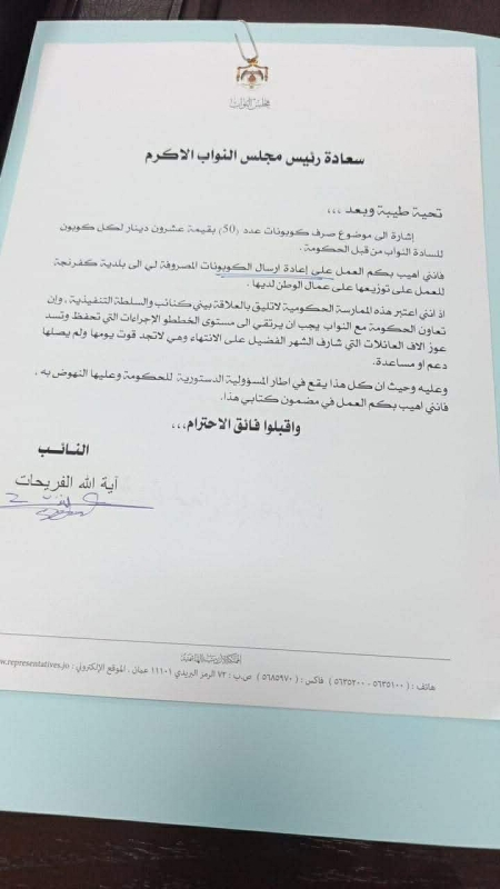 وجه النائب آية الله الفريحات كتابا إلى رئيس مجلس النواب مازن القاضي طلب فيه إعادة إرسال كوبونات المساعدات المصروفة للنواب إلى بلدية كفرنجة، للعمل على توزيعها على عمال الوطن.