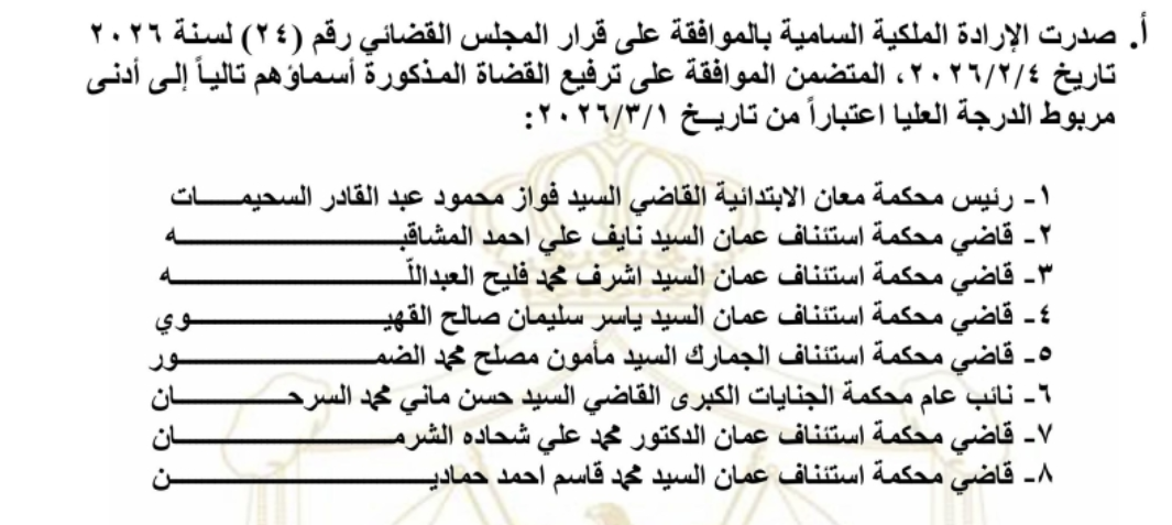 صدرت الإرادة الملكية بالموافقة على قرار المجلس القضائي المتضمن الموافقة على ترفيع القضاة المذكورة أسماؤهم تاليا إلى أدنى مربوط الدرجة العليا اعتبارا من تاريخ ٢٠٢٦/٣/١: